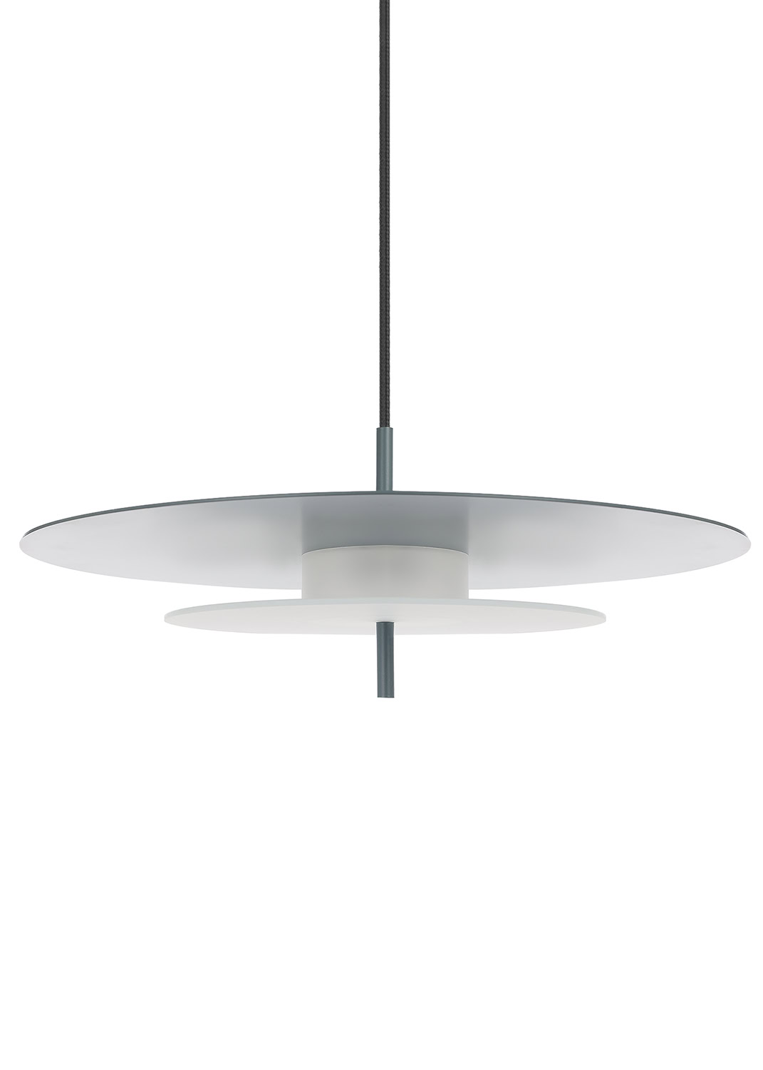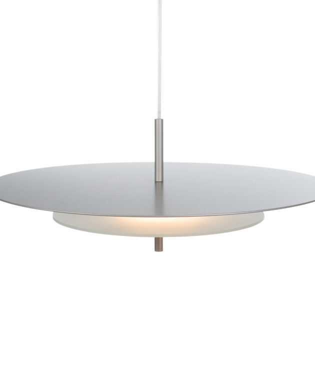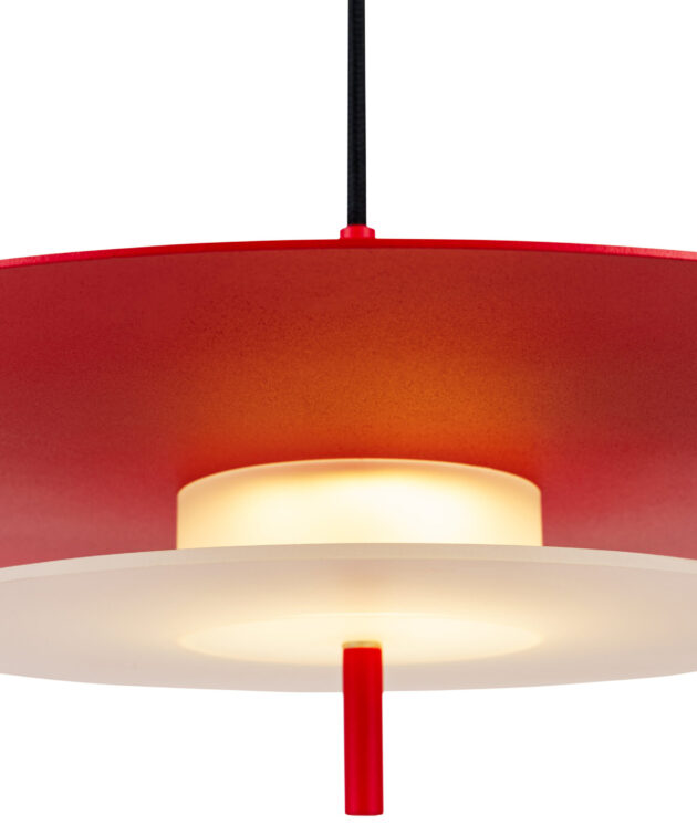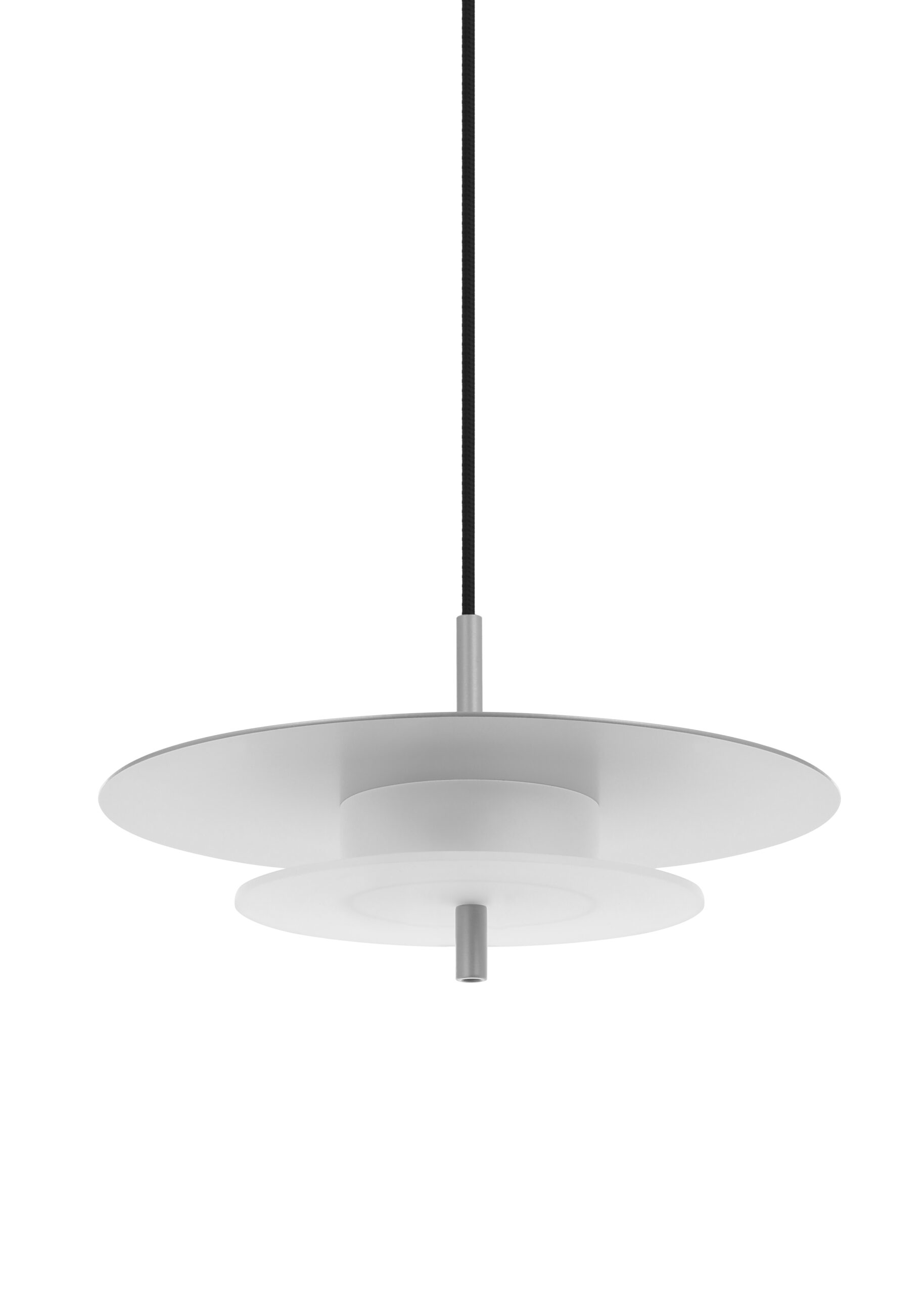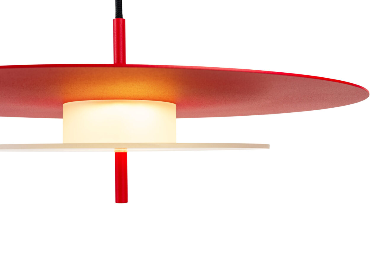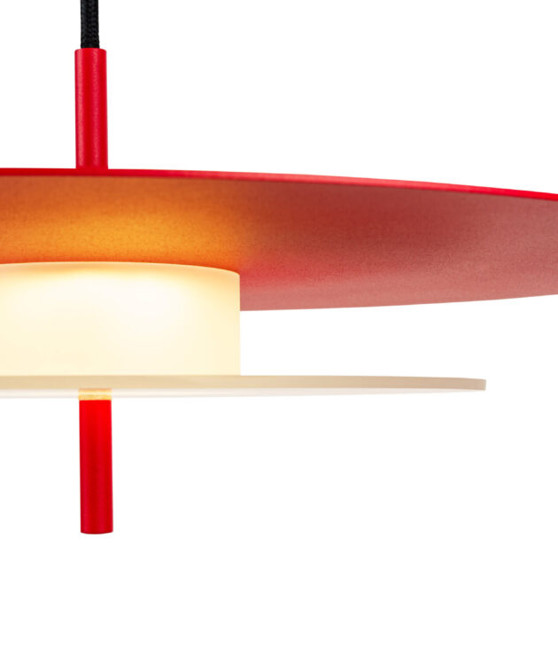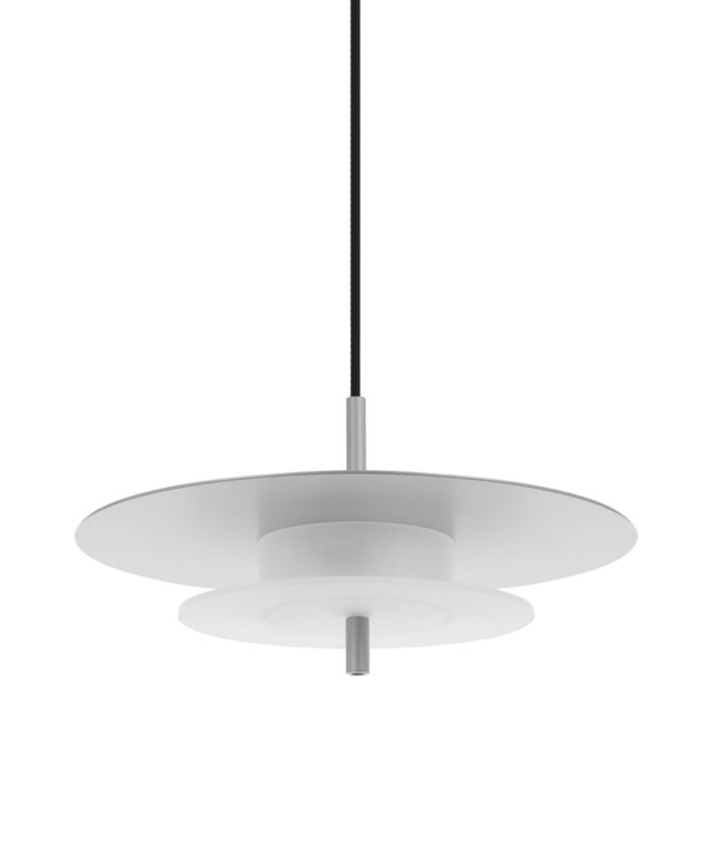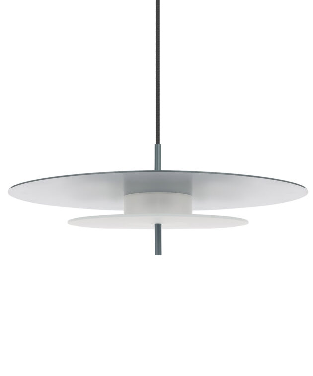 Aeroplan is a pendant lamp with a harmonious, geometric structure built from three circles made of aluminium and frosted glass. The powder-coated aluminium body rests on a glass base that gently diffuses the light. Its composition is closed and balanced – ideal for interiors where proportion, rhythm and purity of form matter.