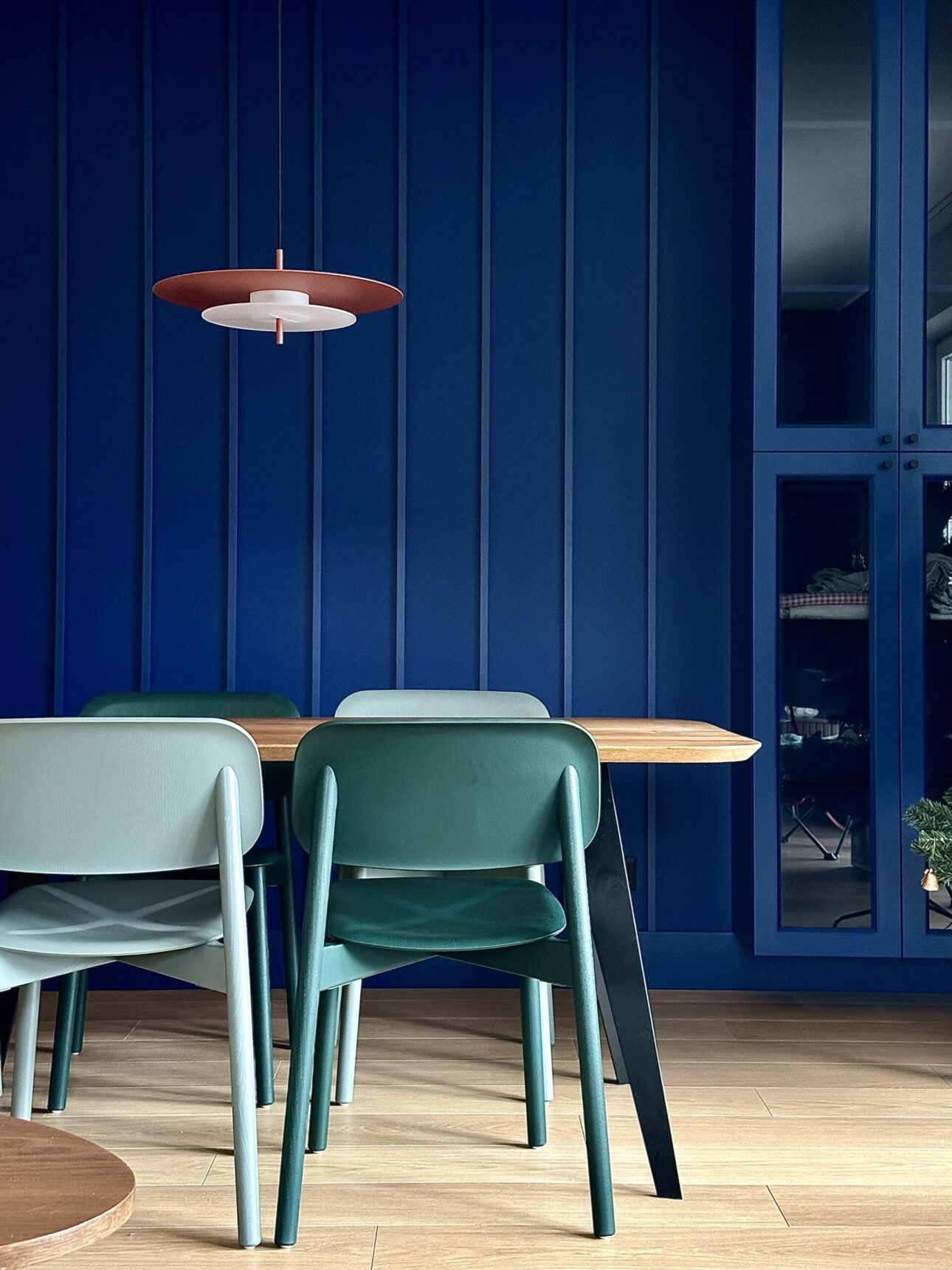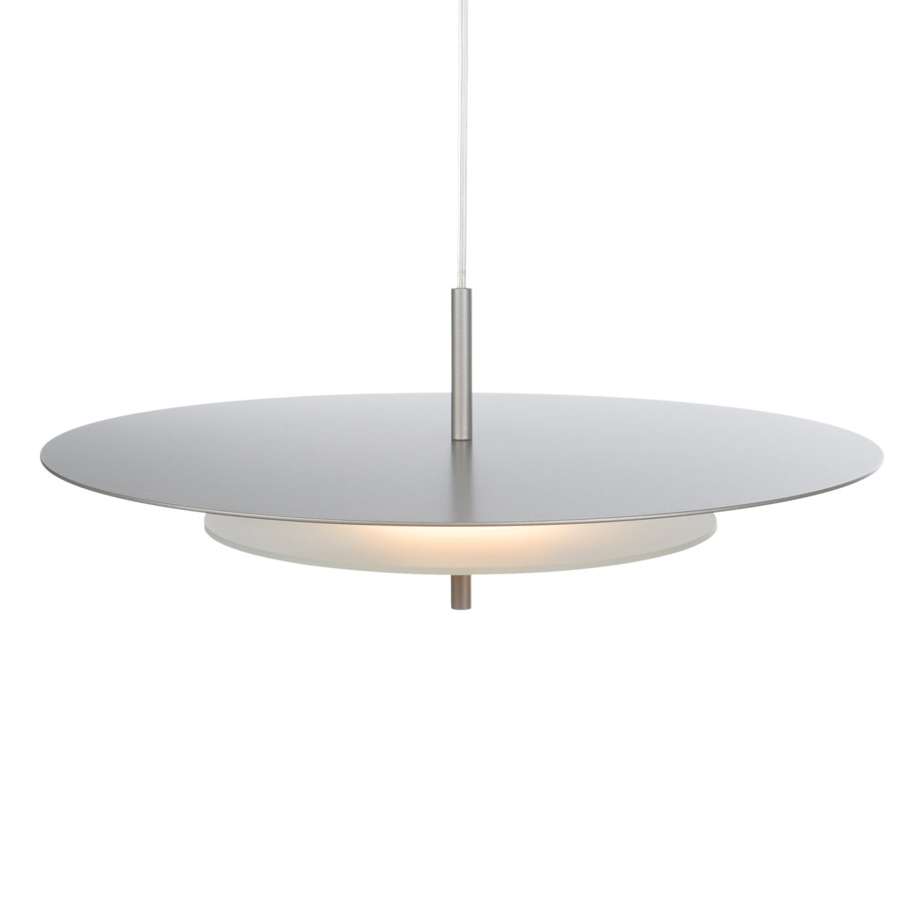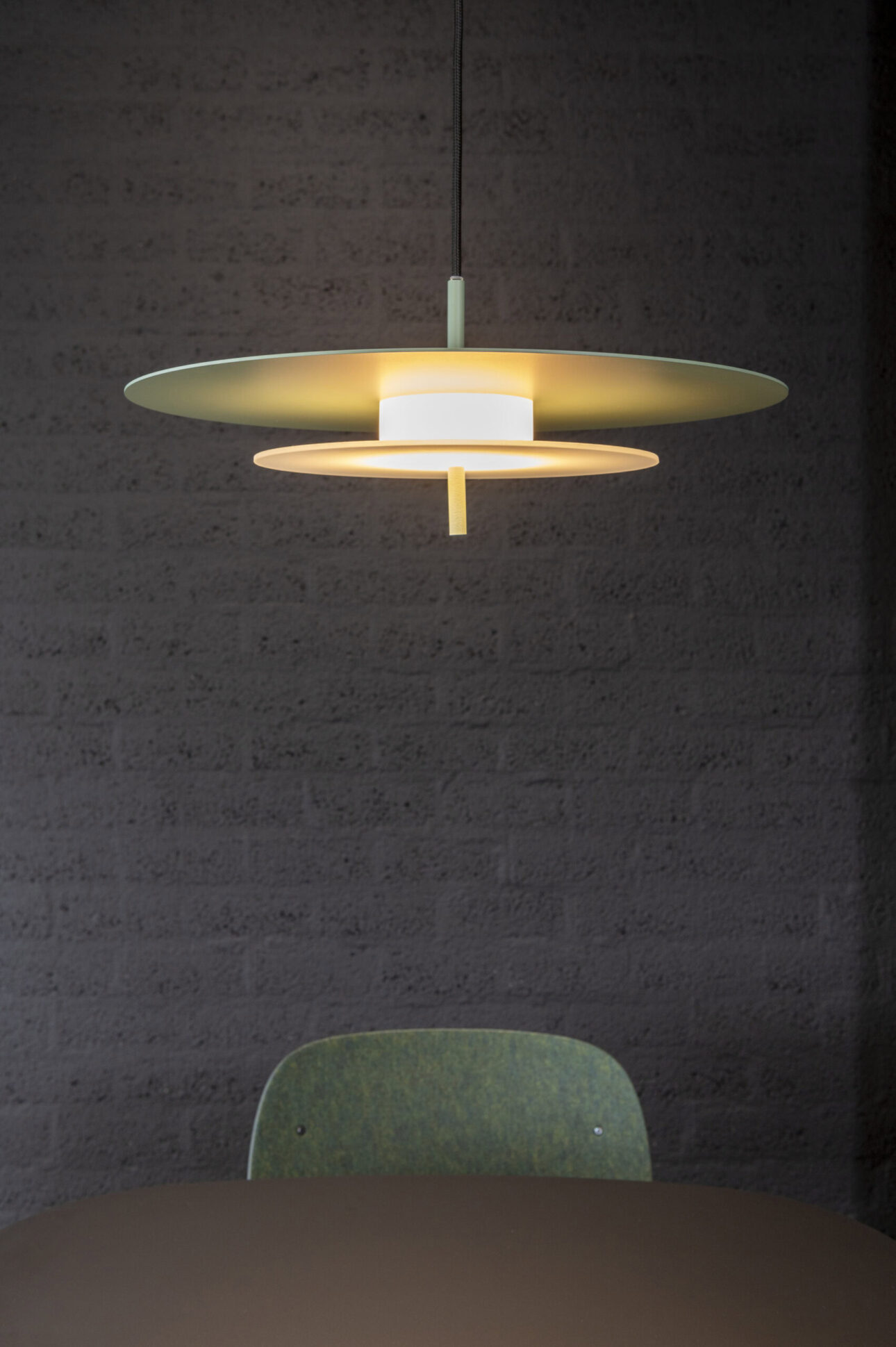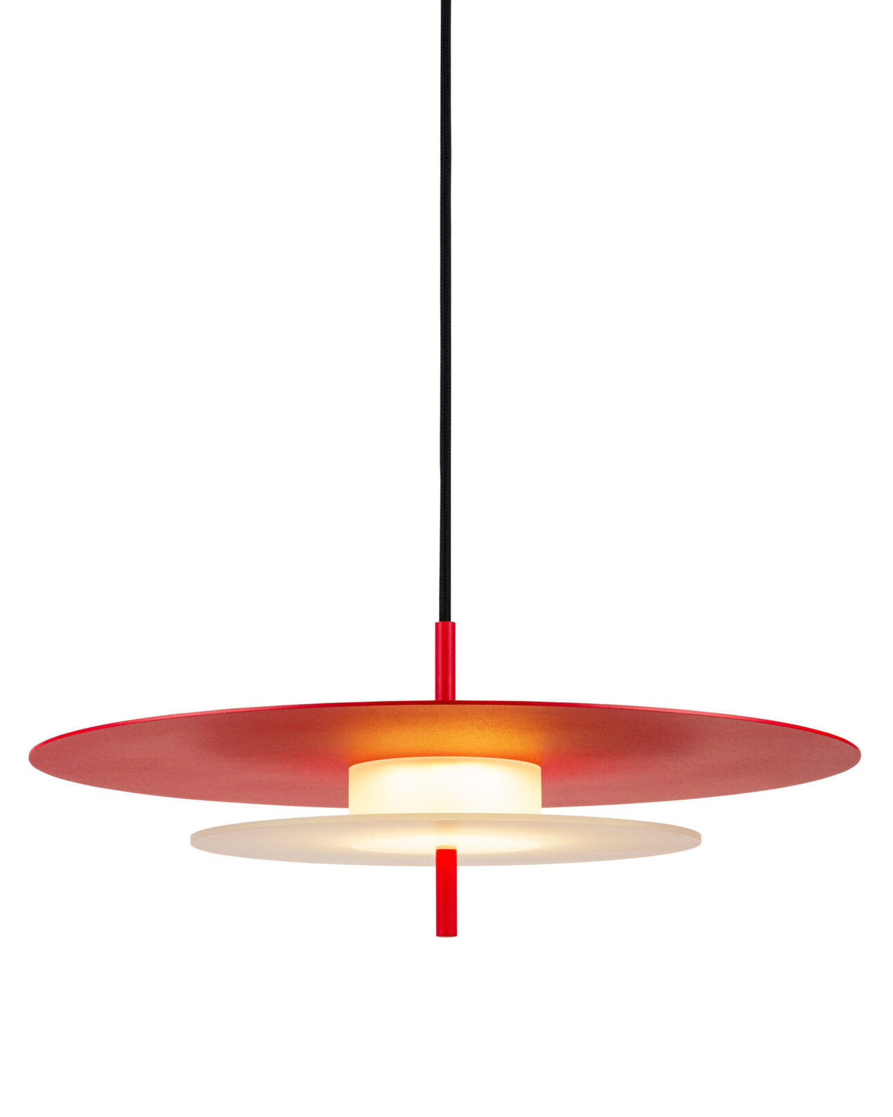 Aeroplan is a pendant lamp with a harmonious, geometric structure built from three circles made of aluminium and frosted glass. The powder-coated aluminium body rests on a glass base that gently diffuses the light. Its composition is closed and balanced – ideal for interiors where proportion, rhythm and purity of form matter.