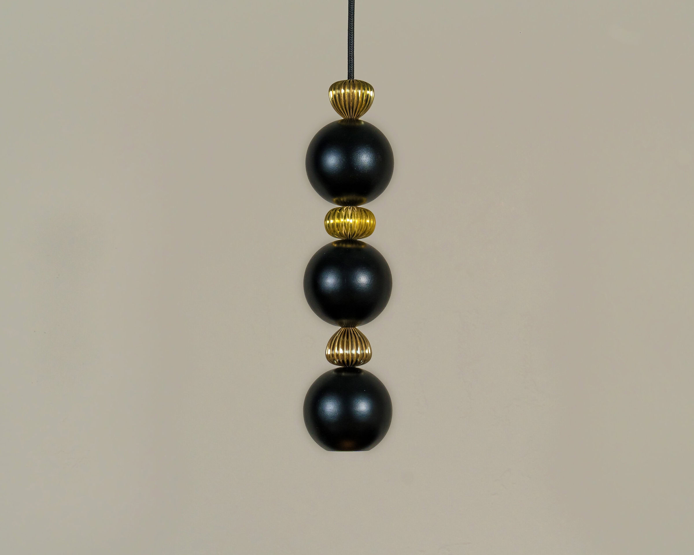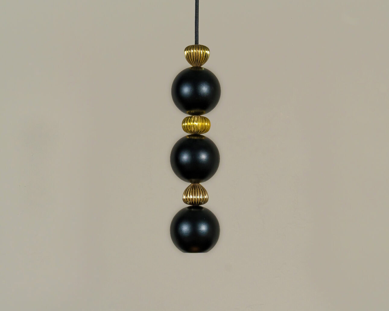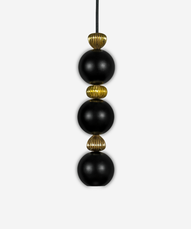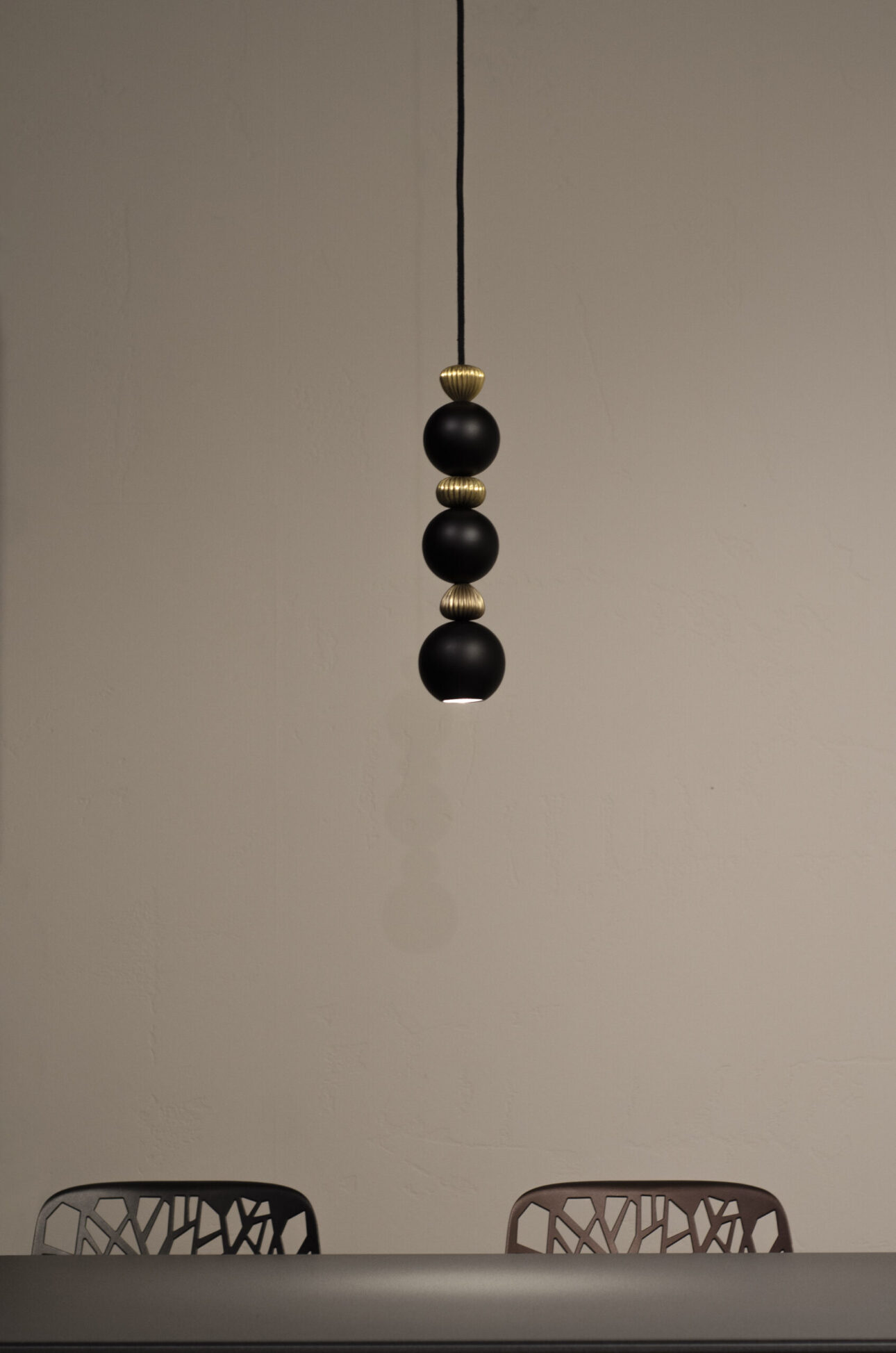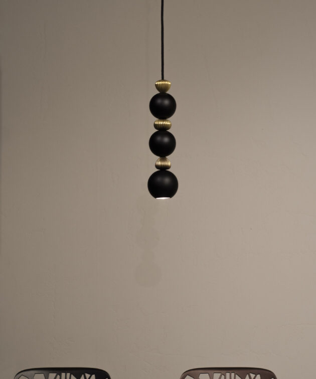 Bola Queen is a contemporary pendant lamp that combines a classic arrangement of spheres with decorative brass accents. The composition is based on powder-coated steel spheres rhythmically interwoven with solid brass rings. Available in three versions – with one, two or three spheres – the lamp can be precisely matched to the scale of the interior. The option of “multi” configurations on a shared ceiling rose further expands the design potential of this collection.
