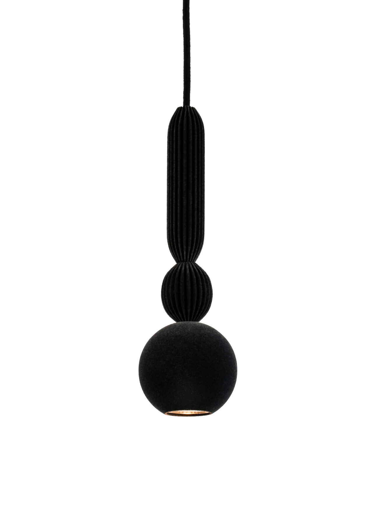 Bosca Velvet is an elegant pendant lamp that combines a raw form with a uniquely tactile surface. The steel sphere and two fluted rings – one small and one elongated – are finished directly with a Velvet coating, giving the whole composition a uniform, deeply matte texture. The delicate fluting of the rings contrasts with the smooth surface of the sphere, creating a balanced and refined composition. The lamp can be used individually or arranged in multi-point configurations.