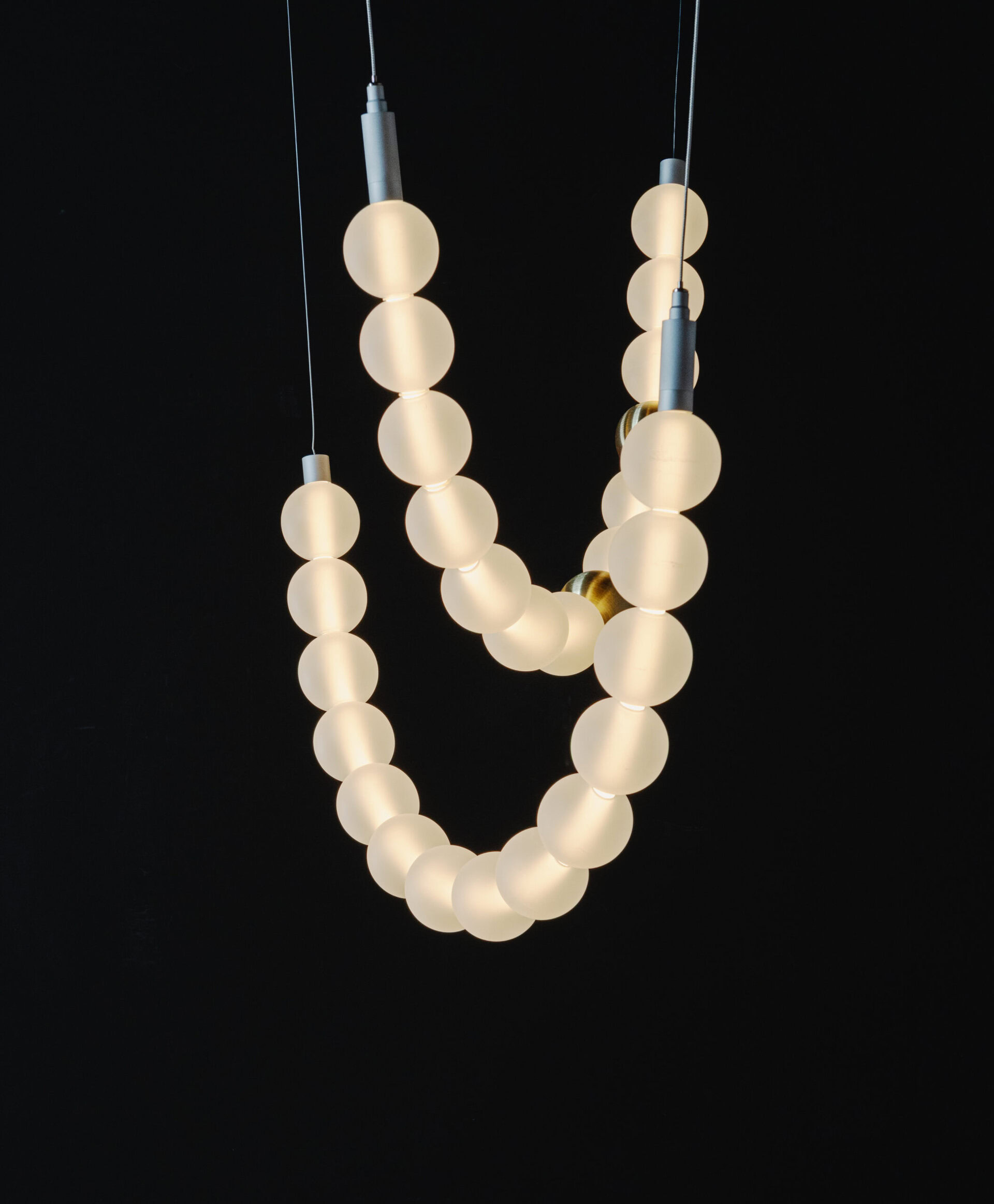 Daisy 710 is a modern pendant lamp inspired by the silhouette of Daisy von Pless’s pearl necklace. A flexible LED tube, wrapped with fourteen frosted glass spheres (Ø 7 cm), creates a dynamic yet subtle rhythm of light. It is designed for interiors where a lamp should be both functional and decorative – elegant, but never excessive.
