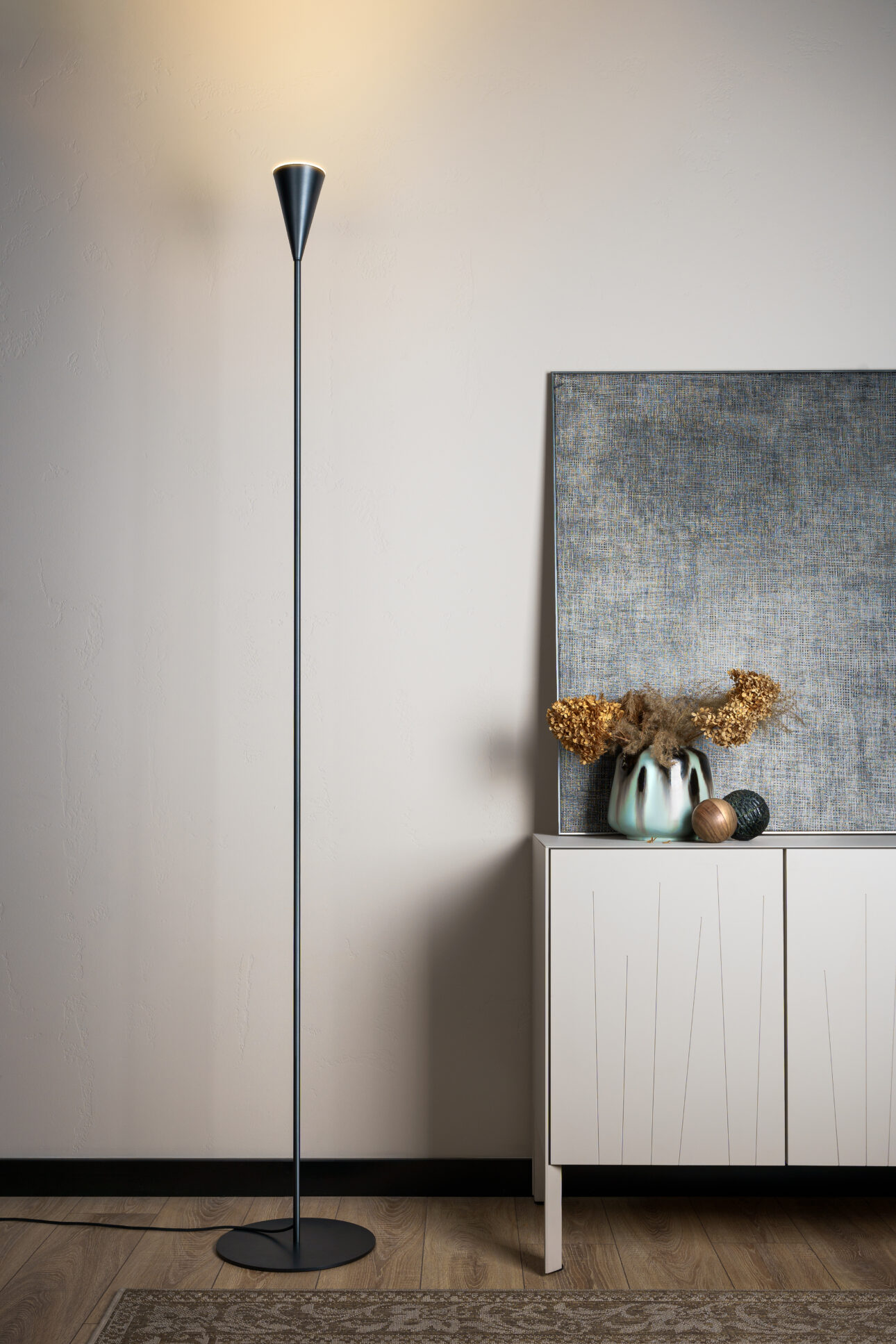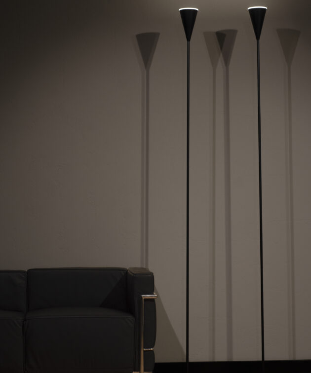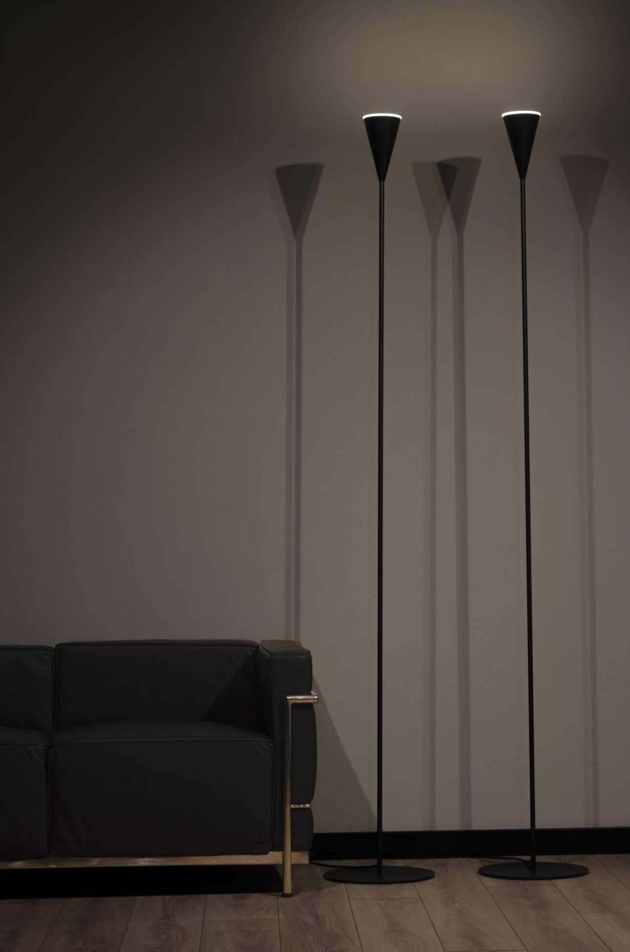 Konik 220 is a minimalist floor lamp that impresses with its simplicity and elegance. Its slender aluminium structure reaches an impressive 220 cm in height and is complemented by a heavy steel base that ensures stability. Light directed upwards is softly diffused by frosted glass, creating a calm, ambient atmosphere in the interior.