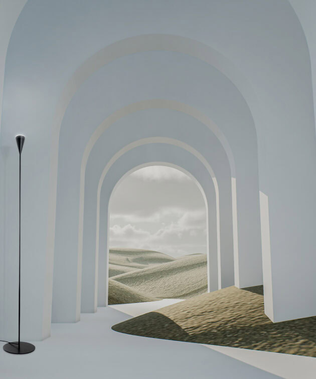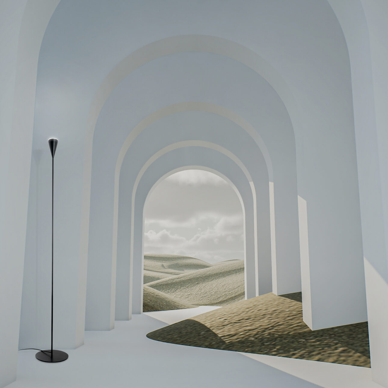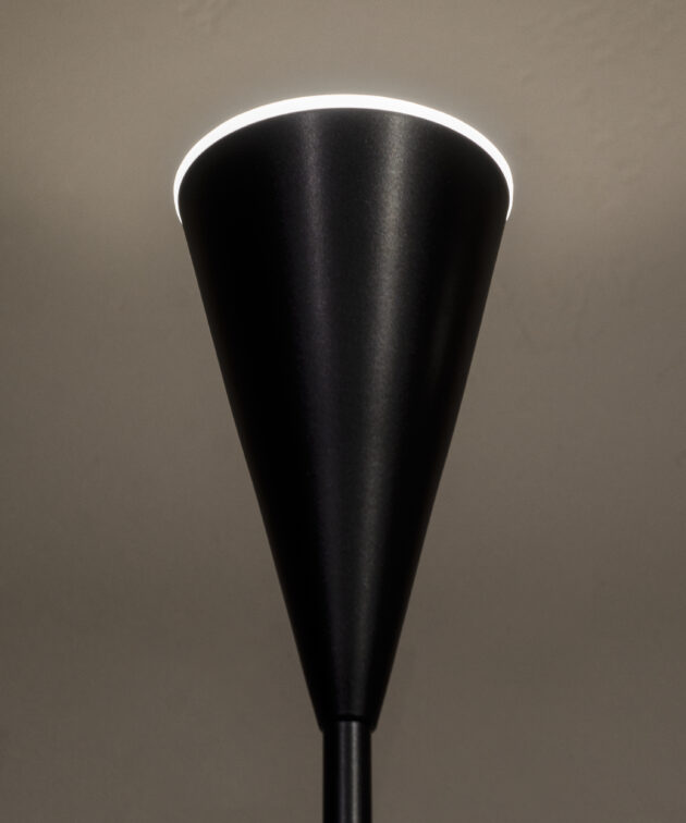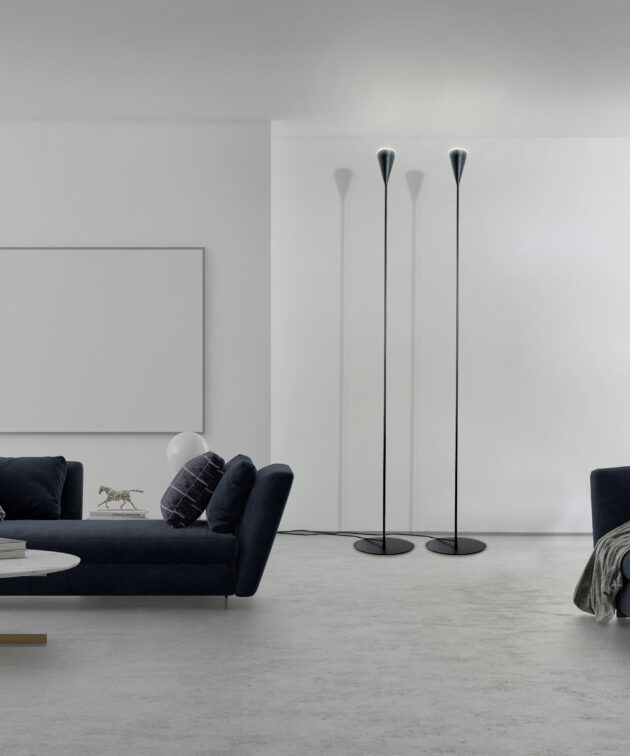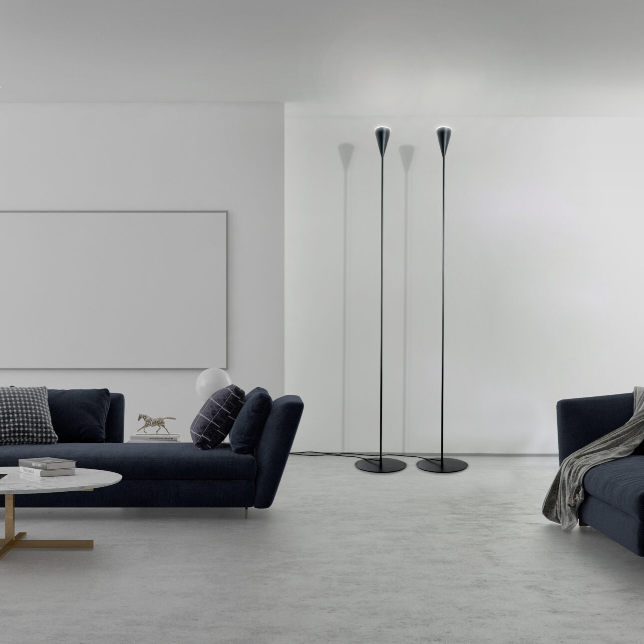Konik 220 is a minimalist floor lamp that impresses with its simplicity and elegance. Its slender aluminium structure reaches an impressive 220 cm in height and is complemented by a heavy steel base that ensures stability. Light directed upwards is softly diffused by frosted glass, creating a calm, ambient atmosphere in the interior.