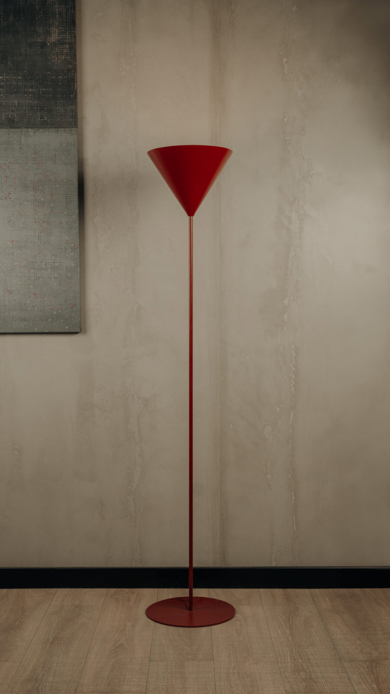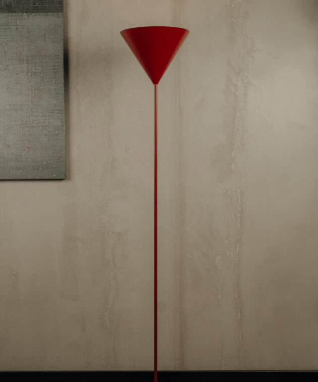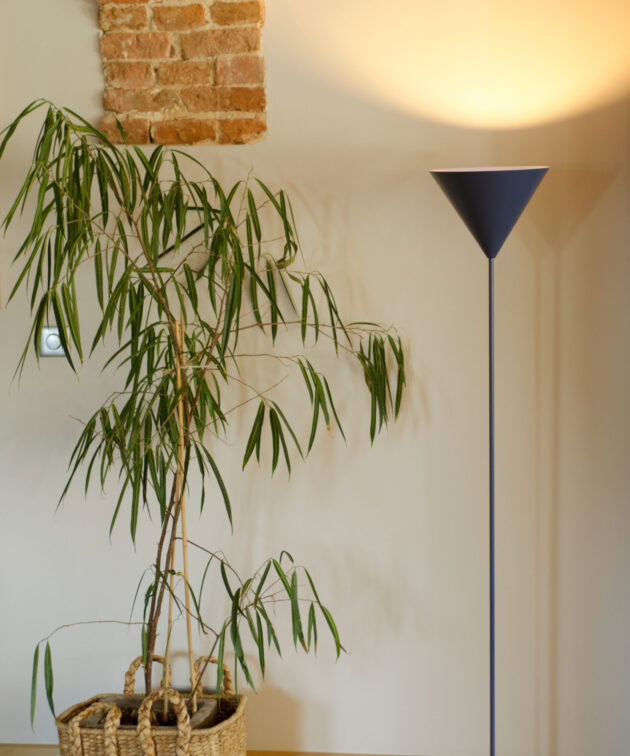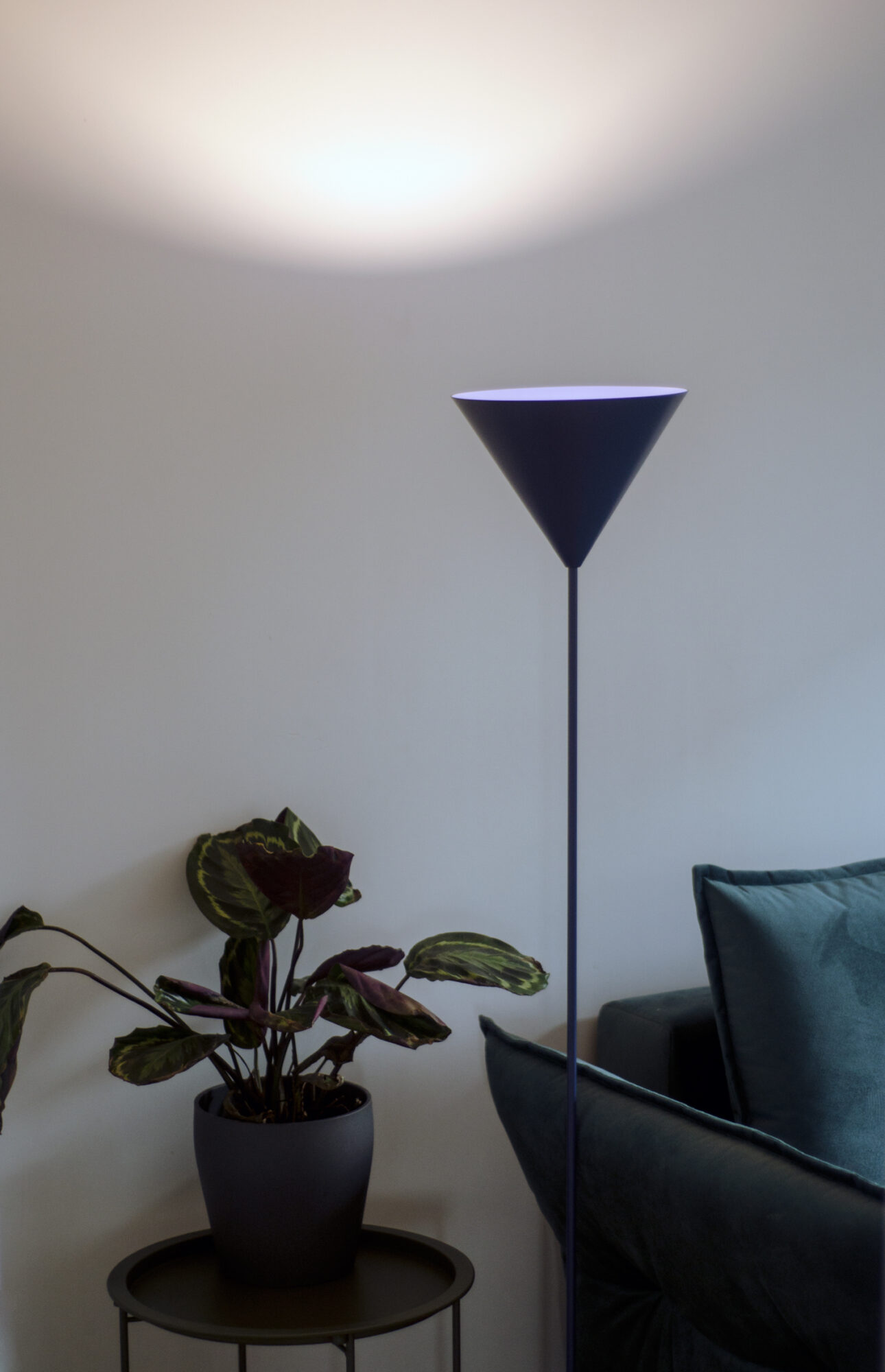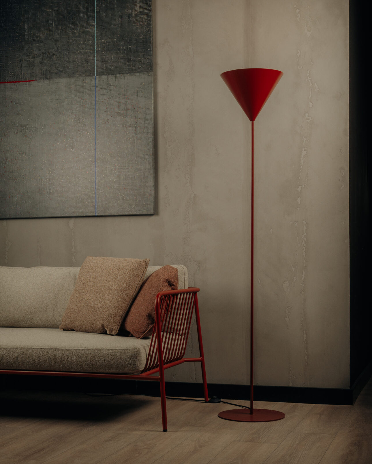 Konko Floor is a contemporary floor lamp that combines precise craftsmanship with raw aesthetics. The 30 cm powder-coated aluminium shade is mounted on a solid steel base – available in two versions: round or rectangular. Together they form a balanced, cohesive composition, perfect for interiors with an industrial, modern, or gallery-like atmosphere.