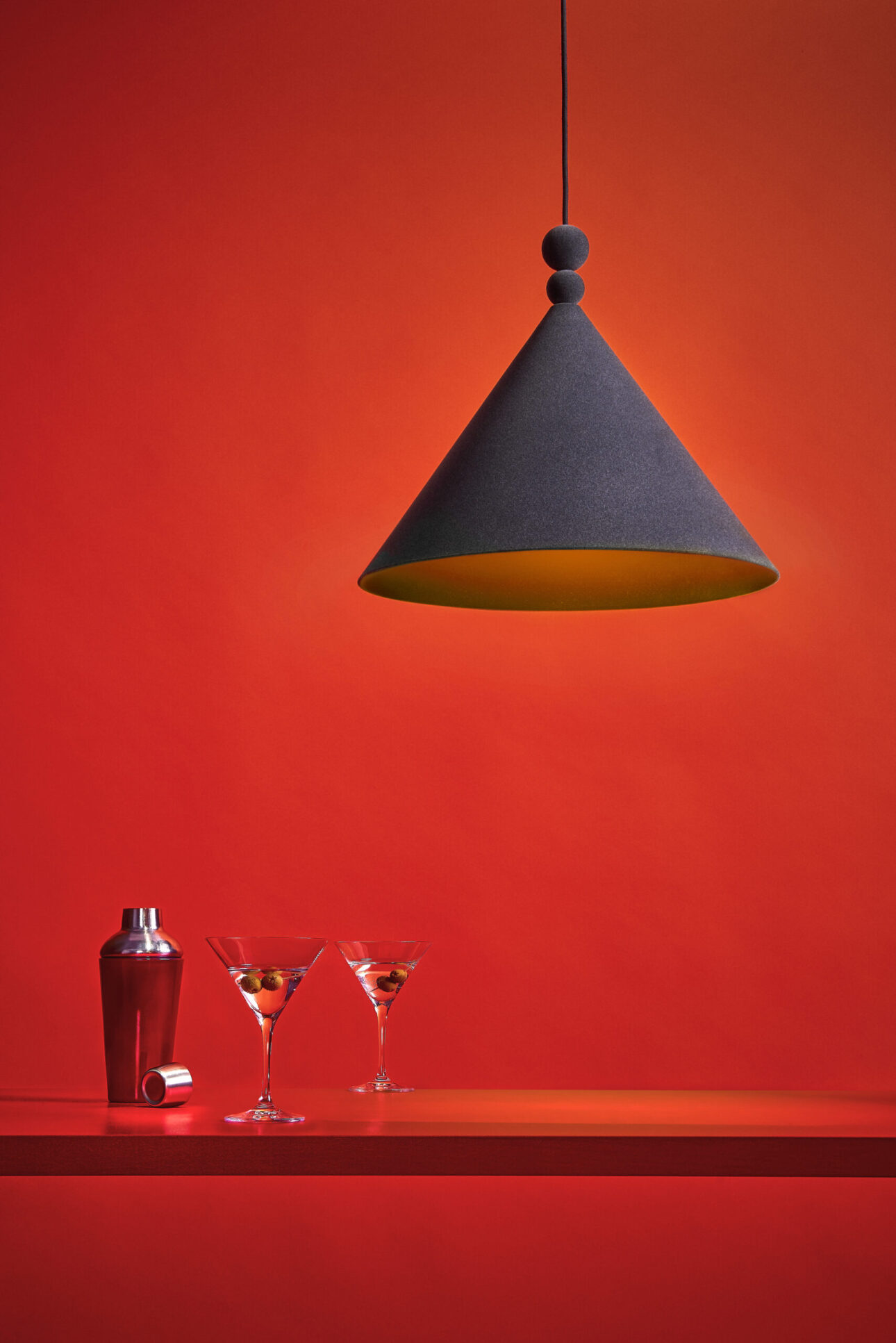 Konko Velvet is a modern pendant lamp where the classic conical shape is redefined by a velvet finish. Two distinctive spherical details above the shade – one smaller, one larger – add balanced elegance to the design. The shade, ceiling rose, and decorative spheres are all coated in the same velvet texture, creating a seamless matte surface with a soft, tactile character.