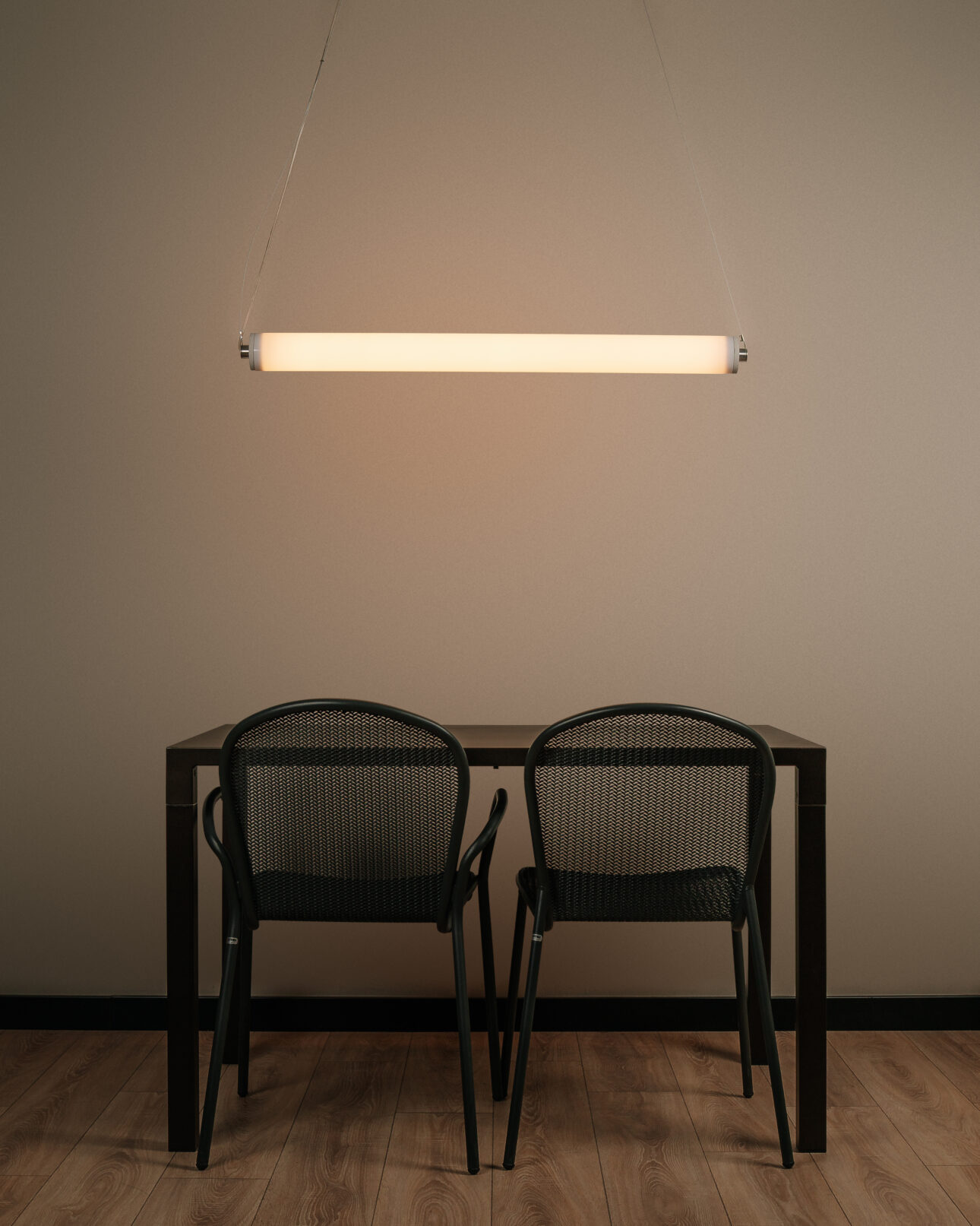 Longa Horizontal is a concrete pendant lamp with a distinctly elongated shape that brings industrial elegance and architectural discipline into interiors. Built around an integrated LED light source and encased in a White Opal PMMA tube, it provides soft, even illumination – perfect for commercial spaces, kitchen islands, or modern dining areas. Concrete end caps give the lamp its bold form, while four available lengths allow it to adapt to any scale of interior.