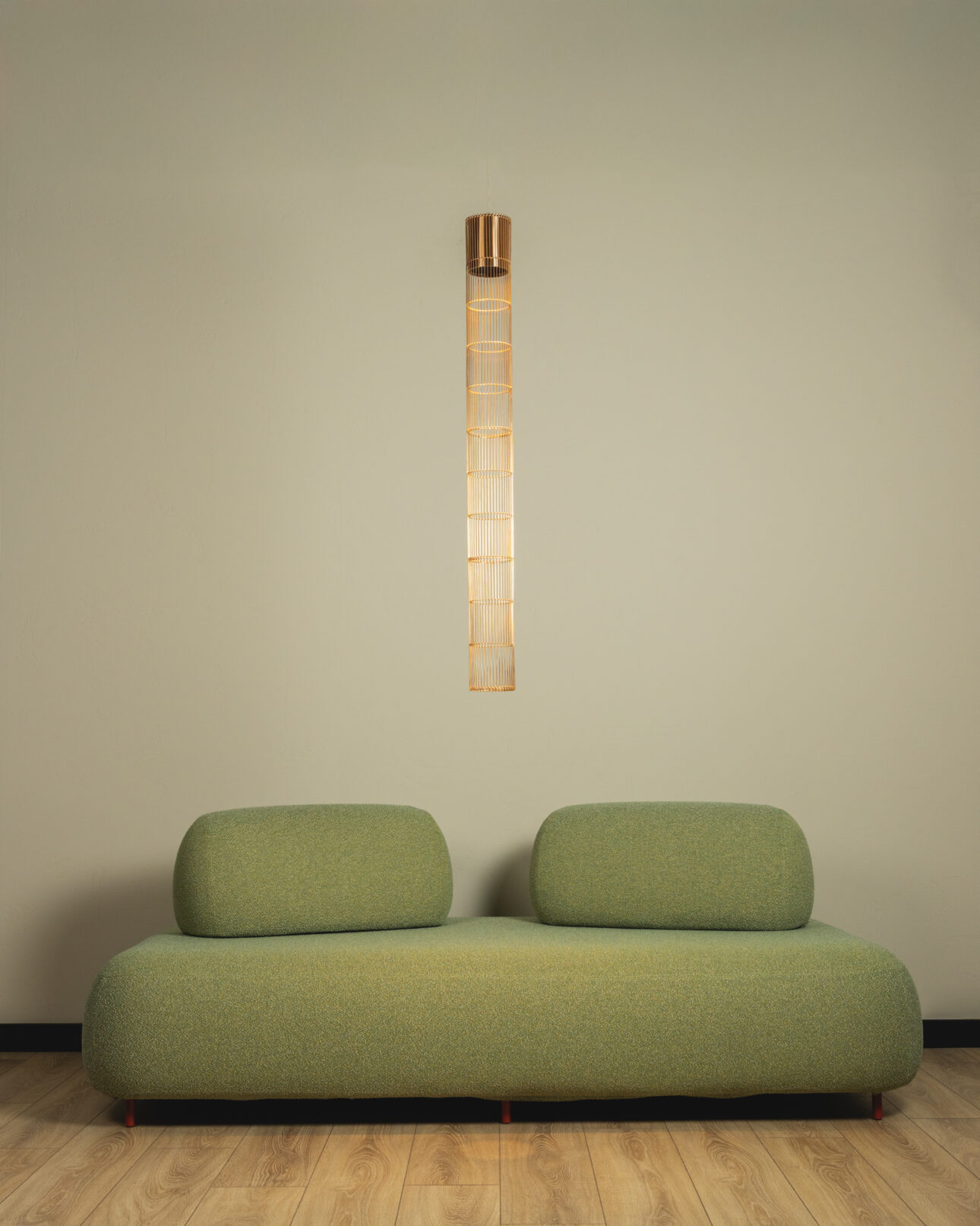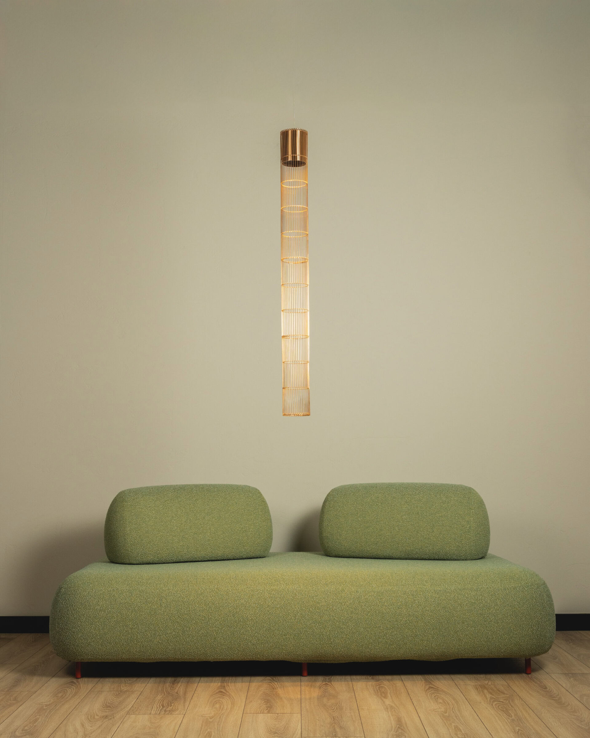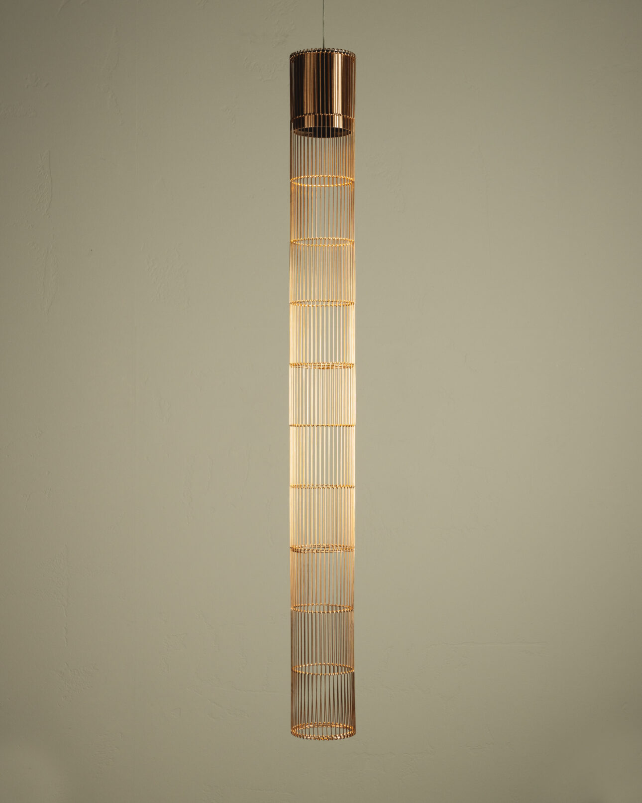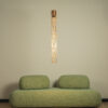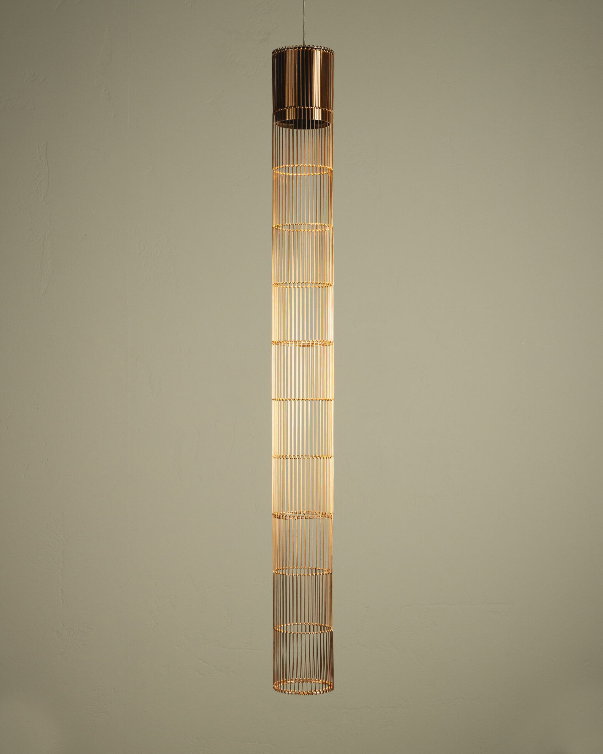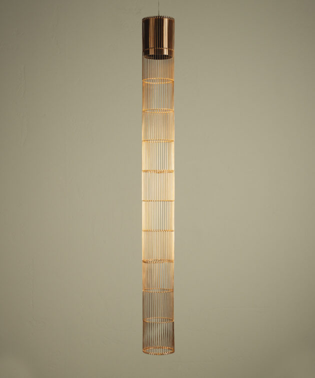 Stelar is a vertical LED pendant lamp with a striking form that combines the rawness of aluminium with the delicacy of bent metal mesh. The result is a luminous, architectural structure – ideal for modern and artistic spaces. Its metallic phosphor bronze surface, with a distinct reflective sheen, accentuates every detail and highlights the rhythm of the form.