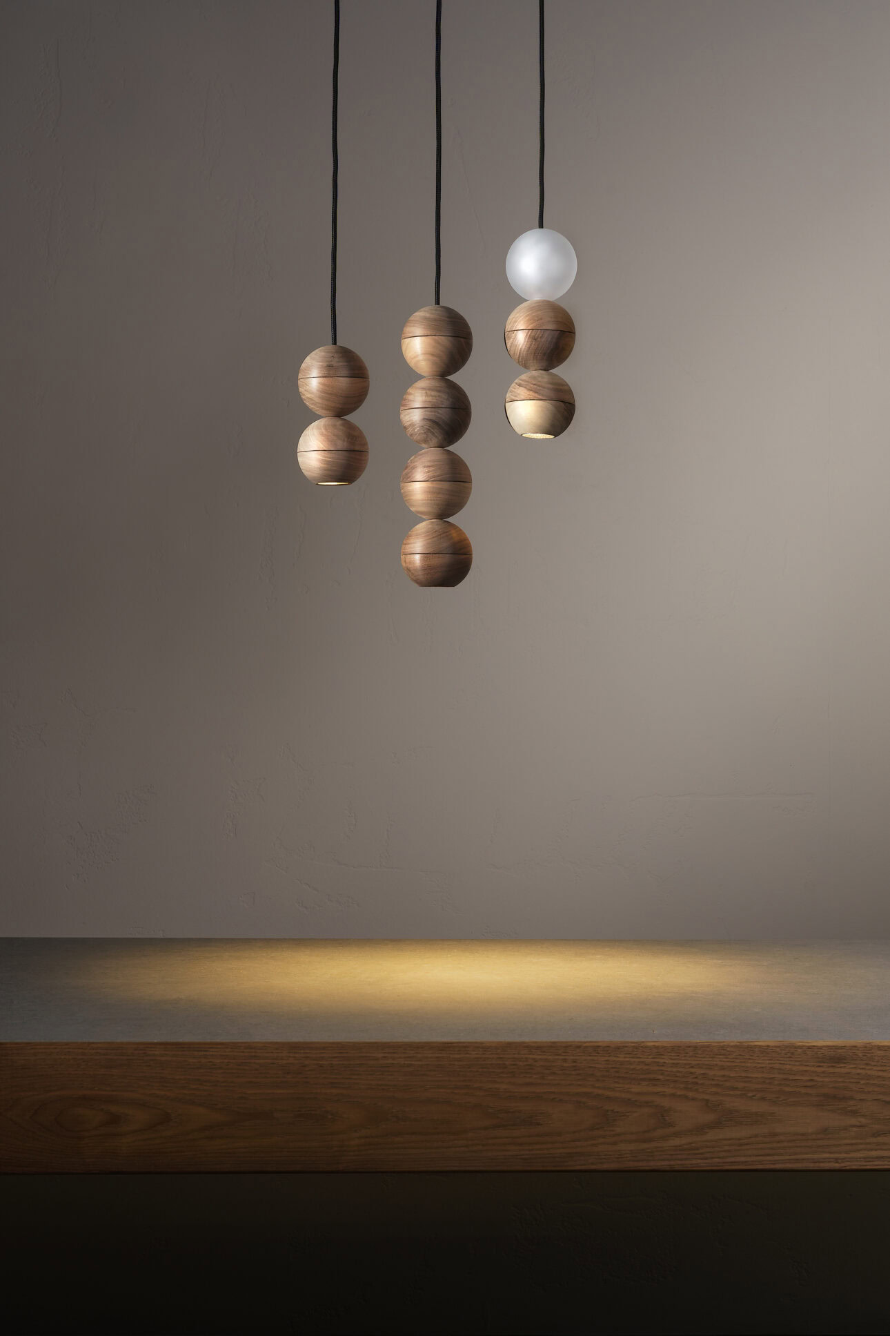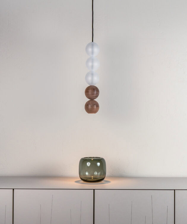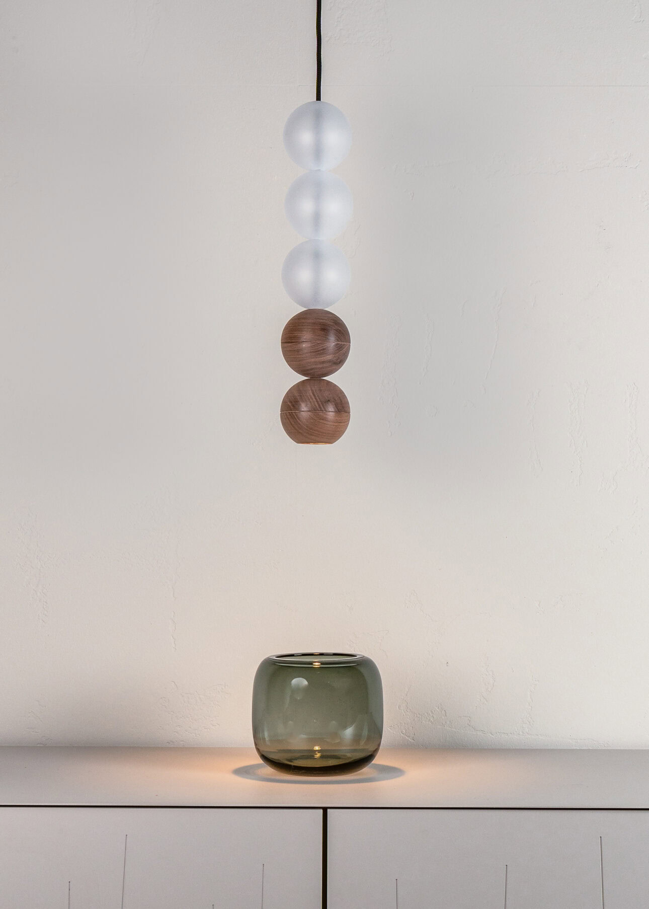 Woodoo Glass is a pendant lamp that combines the raw beauty of solid American walnut with the subtle glow of a sandblasted glass sphere. This design continues the formal language of the Woodoo collection, enriched by contrasting textures and delicate light diffusion.